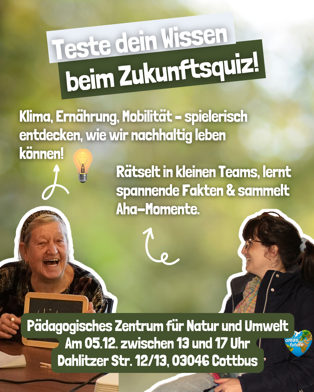 Am 5. Dezember laden wir euch herzlich zu einem offenen Quiznachmittag rund um Nachhaltigkeit, Umwelt und Zukunftsthemen ein – gestaltet in Kooperation mit dem Verein Omas for Future. Eingeladen sind alle, ob jung oder alt: Eltern mit ihren Kindern, Jugendliche, Naturbegeisterte, Quizliebhaber oder Senior:innen. Rätselt gern in kleinen Teams miteinander.